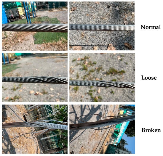 A total of 1660 transmission line images were collected in this experiment, which contained three health states: healthy, loose strand, and broken strand. Among them, there were 660 normal samples, 646 scattered stock fault samples, and 354 broken stock fault samples, and the resolution of each image was 3024 × 4032. The dataset of transmission lines was processed using the proposed multi-threshold segmentation and morphological method based on HSV color space, and the dataset shown in Figure 4 was obtained. Then, the data set processed by the multi-threshold segmentation and morphology method based on HSV color space was divided, in which 60 samples of each class were used as the test set, and the remaining samples of each class were used as the training set. The division of the data set is shown in Table 1.