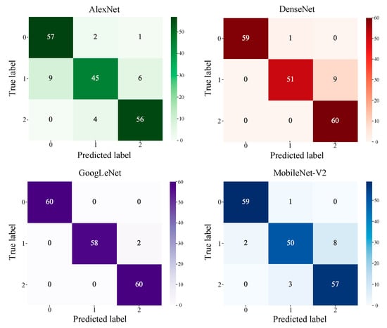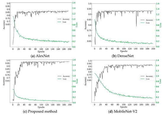 To verify the effectiveness of the improved model proposed in this paper, AlexNet with the cross-entropy loss function, MobileNet-V2, and DenseNet were selected for comparison. The other conditions of the three models were consistent with those of the model in this paper, except for the loss function, and all models were trained for 200 rounds. All experiments were repeated 10 times and the average metrics of 10 tests were employed for evaluation, including accuracy, recall, F1-score, and minimum loss. The metrics of all models are shown in Table 2, while the training curve and loss curve of the training set are shown in Figure 5, and the confusion matrices with the highest results among the 10 tests for all models are plotted in Figure 6.