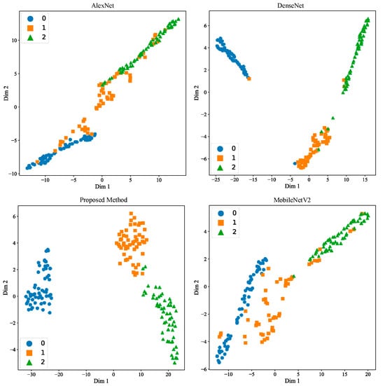 In order to further validate the effectiveness of proposed the improved GoogLeNet, the classification results of the validation set of the four methods were visualized by T-SNE (t-distributed stochastic neighbor embedding), as shown in Figure 7. As can be seen from the figure, the proposed method had the lowest misclassification compared with the other three methods. In addition, the DenseNet model had good classification performance compared with MobileNetV2 and AlexNet. The AlexNet model achieved the worst classification performance in this dataset, and there was more overlap of misclassification between the three categories.