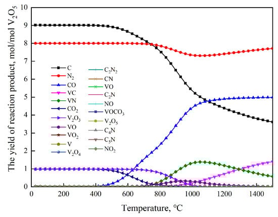 3 decreases dramatically with increasing temperature, which favors conversion to VN, VC, and VO (Equations (6) and (9)). The content of VN initially increases, peaks at approximately 1048 °C, and then decreases rapidly. This indicates that the formation reaction of VN tends to reverse at higher temperatures (1048~1500 °C), and combined with changes in VC concentration, suggests that excessively high temperatures hinder the formation of VN (Equation (11)). According to Le Chatelier’s principle, the increase in temperature promotes the forward reaction between vanadium oxide and C, increasing the VC content.