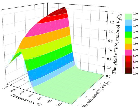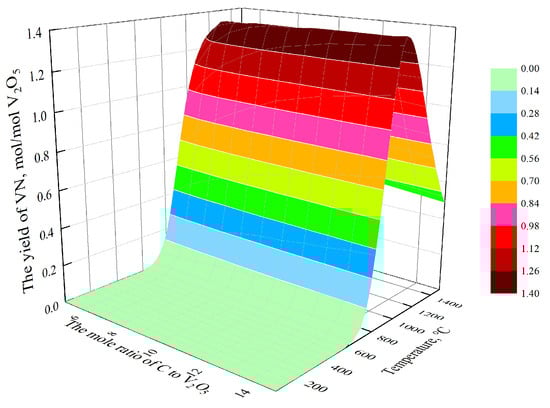 5 ratio of 10:1, the VN production increases by approximately 135% from 600 °C to 1000 °C, and then decreases by approximately 58.08% from 1000 °C to 1500 °C. Endothermic reactions (Equations (7)–(10)) advance with increasing temperature, increasing VC generation, and, consequently, improving VN production (Equation (11)). However, at elevated temperatures, the exothermic nature of Equation (11) reverses itself, leading to increased VN consumption and a decrease in content. Under specific temperature conditions, an increase in the C:V