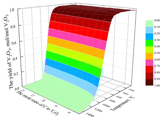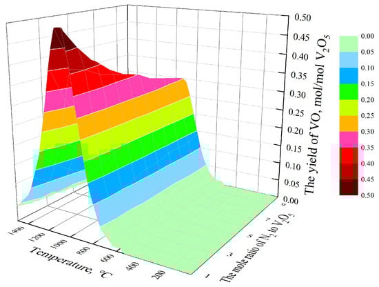 3 (Equations (6) and (9)) is greater than zero, hindering its effective conversion to VO and VN and resulting in a high yield. According to Le Chatelier’s principle, as the temperature increases, exothermic reactions (Equations (2) and (4)) proceed in the reverse direction, while endothermic reactions (Equations (6) and (9)) advance, leading to a rapid decrease in V
