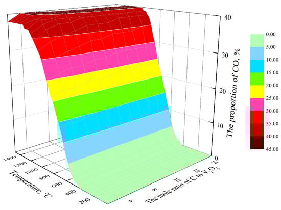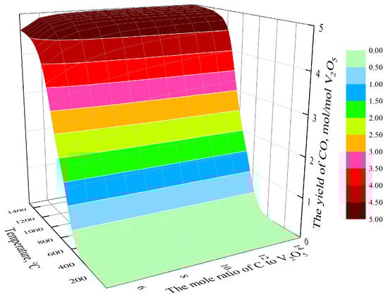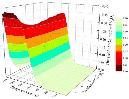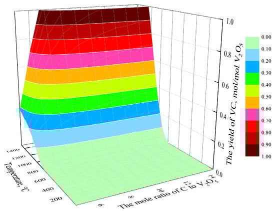 5 ratio increases, the formation of VO initially increases at lower temperatures but diminishes at higher temperatures. When the temperature is low, the formation of VO is primarily driven by Equation (3), and as the C content increases, the reaction progresses, resulting in an increased production of VO. Under high-temperature conditions, an increase in the C content accelerates the conversion of VO to VC (Equation (10)), leading to a reduction in the VO content. Additionally, as the C:V
