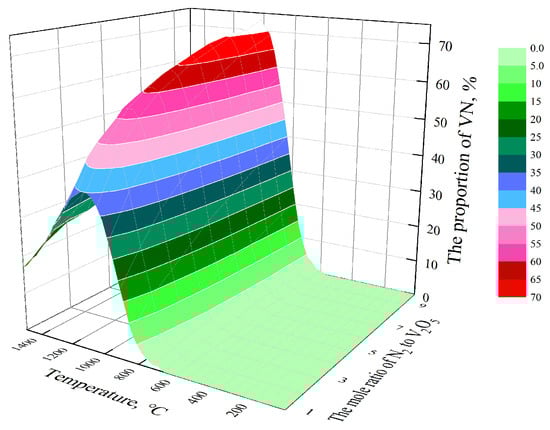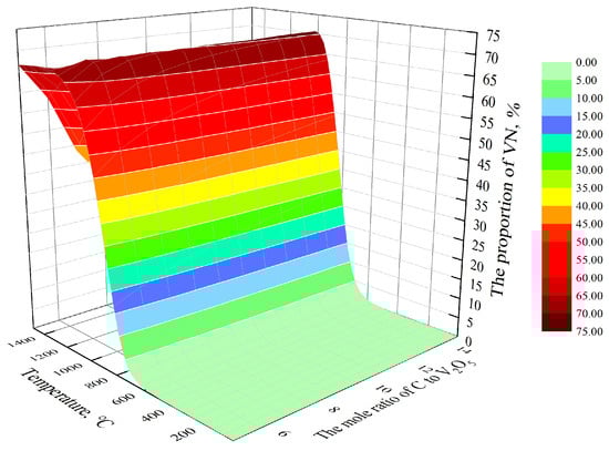 5 ratio exceeds 5, the concentration of VN initially increases and then decreases with increasing temperature. At lower temperatures, VC production does not occur; however, the VC content peaks at approximately 1078 °C. According to Le Chatelier’s principle, the reactions (Equations (7)–(10)) progress in the forward direction, suggesting that within a certain temperature range, the VN yield increases due to the elevated levels of VC (Equation (11)). However, at excessively high temperatures, the ΔG of VN becomes positive (Equation (11)), indicating that VN no longer meets the thermodynamic conditions for formation, leading to a reduction in its yield. Under specific temperature conditions, the proportion of VN gradually increases with the rise in the C:V