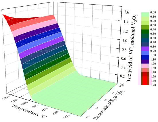 5 ratio, the amount of VO at lower temperatures (<900 °C) gradually increases, whereas the content of VO at higher temperatures (>900 °C) gradually decreases. According to Le Chatelier’s principle, an increase in N2 fosters an increase in the content of C (Equation (11)), thus promoting the forward progression of (Equations (3), (5) and (6)) and the gradual increase in VO production. At higher temperatures, if the ΔG of Equation (11) is greater than 0, the reaction cannot proceed and the C content decreases, leading to a reduction in the VO content.