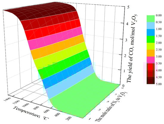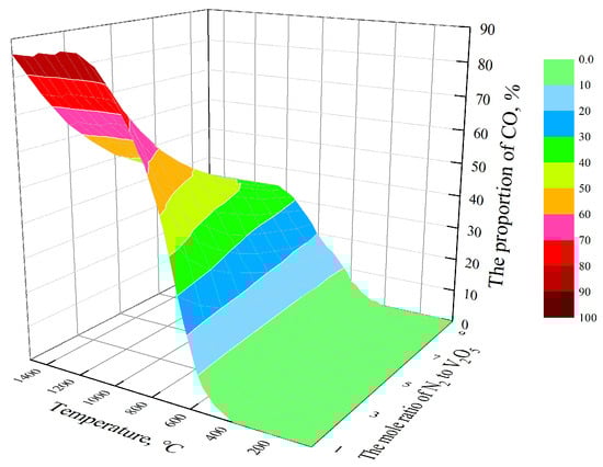 5 ratio increases, its impact on CO concentration is minimal. This phenomenon could be attributed to the chemical equilibrium state of the system or the kinetic characteristics of the reaction, where the CO generation and consumption rates achieve a balance, resulting in a relatively stable CO concentration. Calculating the proportion of CO products reveals its formation under different raw material conditions. This demonstrates that a certain yield of CO can be produced during VN generation. The CO produced can serve as fuel for the manufacture of iron in the blast furnace, providing a reference for the secondary utilization of resources in the preparation of VN.