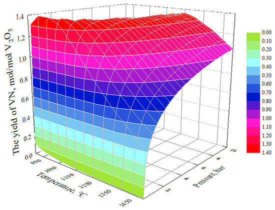 −5 bar to 1 bar), the VN yield initially increases and then decreases with increasing temperature; at lower pressure settings, the VN yield is higher. For example, at 1 bar, the VN yield increases by 64.48% as the temperature increases from 900 °C to 1050 °C but decreases by 54.92% from 1050 °C to 1500 °C. According to Le Chatelier’s principle, during the VN generation process (Equation (11)), VN production increases as a result of the positive shift with rising pressure. However, in most VC formation reactions (Equations (7)–(10)), the reactions reverse, so that when pressure exceeds a certain threshold, the VC content is reduced and, consequently, the VN yield diminishes. Additionally, the exothermic reaction (Equation (11)) reverses at excessively high temperatures, leading to a decrease in VN production.