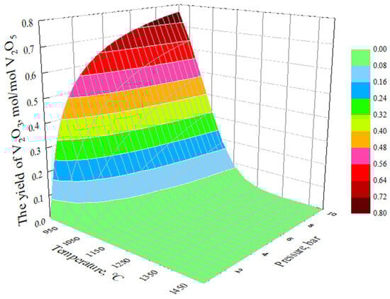 3 at 1500 °C is nearly zero. According to Le Chatelier’s principle, when the temperature rises, the exothermic reaction (Equation (4)) proceeds in reverse, and the endothermic reactions (Equations (6) and (9)) advance, which reduces the formation of V