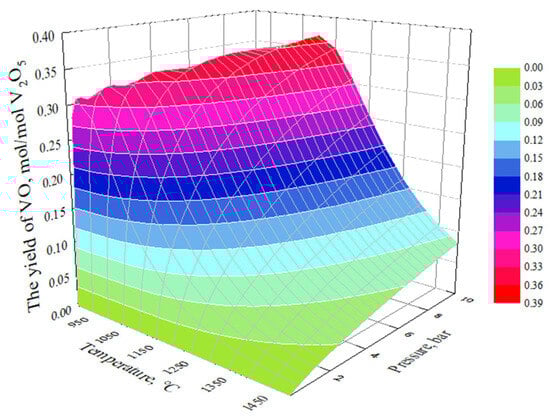 5 ratio of 10:1, along with varying temperature and pressure conditions, on VO production. The graph shows that within a specific temperature range (900 °C to 1050 °C), the VO output initially increases rapidly with increasing pressure and then decreases. When the temperature exceeds 1050 °C, VO production continues to increase with increasing pressure; however, the maximum yield of VO remains lower than that at lower temperatures. According to Le Chatelier’s principle, at very high pressures (Equations (3), (5), (6), and (10)), reactions may reverse, leading initially to an increase and, subsequently, to a decrease in VO production. Under varying pressure conditions, VO production initially increases and then decreases as temperature increases. For example, under a pressure of 1 bar, from 900 °C to 1000 °C, VO output increases by 1.69%, and from 1000 °C to 1500 °C, VO output decreases by about 95%. According to Le Chatelier’s principle, the endothermic reactions (Equations (3), (5), (6), and (10)) progress forward as temperature increases. At lower temperatures, VO is predominantly formed, leading to an increase in output. At higher temperatures, VO is mainly consumed, resulting in a decrease in output, which explains the initial increase and subsequent decrease in VO production.