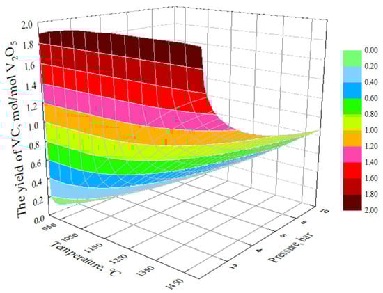 5 ratio of 10:1, across different temperatures and pressures. The figure reveals that under lower temperature conditions (900 °C to 1050 °C), VC production progressively decreases with increasing pressure, with more pronounced reductions at lower temperatures. According to Le Chatelier’s principle, as pressure increases, reactions (Equations (7)–(10)) reverse, while reaction (Equation (11)) advances, leading to a decrease in VC generation and an increase in VC conversion to VN. Under conditions of low temperature and high pressure, VC production diminishes and consumption escalates. Thus, at lower temperatures, VC production decreases with increasing pressure, exhibiting a more marked decreasing trend. Under various pressure conditions, VC production generally increases with increasing temperature. For example, at a pressure of 1 bar, from 900 °C to 1500 °C, VC output increases by 133%. At lower temperatures, VC is converted to VN. Above 1300 °C, the ΔG of reaction 11 exceeds 0, indicating that VN formation does not meet the thermodynamic conditions at this temperature. Simultaneously, according to the Le Chatelier principle, the exothermic reaction (Equation (11)) reverses with increasing temperature, and the endothermic reactions (Equations (7)–(10)) proceed forward, leading to decreased VC consumption and increased production, thus resulting in an increase in VC output as temperature increases. Duan et al. [