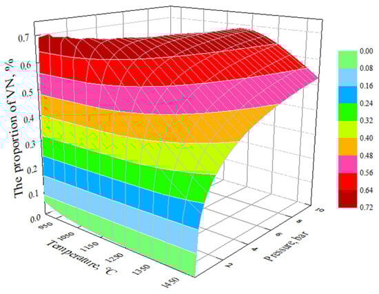 5 ratio of 10:1, under different temperatures and pressure conditions. The figure indicates that within a certain temperature range (900 °C to 1200 °C), the proportion of VN initially increases and then decreases with increasing pressure, with the decreasing trend slowing as temperature increases. The VN proportion is higher at lower pressures. For example, at 1050 °C, as pressure increases from 0.2 bar to 1 bar, the proportion of VN increases by 11.44%, but as pressure continues from 1 bar to 10 bar, the proportion of VN decreases by 21.82%. At higher temperatures, the proportion of VN increases with pressure, though it remains lower than that under lower-temperature conditions. At a specific pressure, the proportion of VN first increases and then decreases with increasing temperature. For example, at 1 bar, as the temperature rises from 900 °C to 1050 °C, the VN proportion increases by 33.02%. However, as the temperature increases from 1050 °C to 1500 °C, the VN proportion decreases by 58.63%. At high temperatures, the ΔG of the reaction (Equation (11)) becomes positive, reversing the reaction and leading to a reduction in the proportion of VN due to excessive temperature.