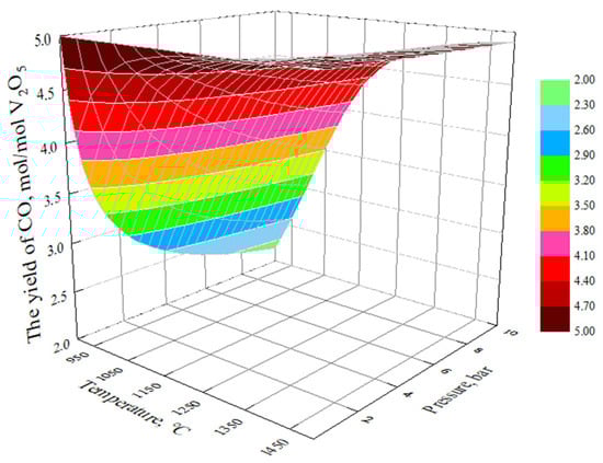 5 ratio of 10:1, under different temperatures and pressure conditions. The figure indicates that at lower temperatures (≤950 °C), the CO concentration gradually decreases with increasing pressure. When the temperature exceeds 950 °C, CO concentration initially increases slightly and then gradually decreases with increasing pressure. According to Le Chatelier’s principle, under lower temperature conditions, increasing pressure causes the reaction (Equation (12)) to shift in reverse, resulting in decreased CO production. As the temperature increases, the endothermic reaction (Equation (12)) progresses forward, leading to increased CO production. However, with further pressure increases, CO shifts negatively, causing CO content to decrease again. Under varying pressure conditions, CO concentration first increases and then decreases with rising temperature. Furthermore, as pressure increases, CO reaches its maximum concentration (about 40%) at higher temperatures. According to Le Chatelier’s principle, a higher concentration of CO correlates with a higher amount of VN products. Therefore, higher pressure is not conducive to the formation of VN and CO products. Dong et al. [
