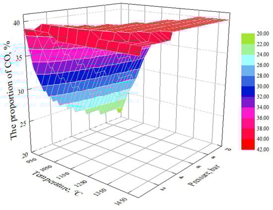 5 ratio of 10:1, under different temperatures and pressure conditions. The figure indicates that under various temperature conditions, CO production decreases with increasing pressure. According to Le Chatelier’s principle, an increase in pressure causes the reaction (Equation (12)) to reverse, leading to a reduction in CO production. Under different pressure conditions, CO production gradually increases with increasing temperature, with the trend being more pronounced at lower temperatures (900 °C to 1050 °C). For example, at a pressure of 1 bar, as the temperature increases from 900 °C to 1050 °C, CO output increases by 36.66%, but as the temperature rises from 1050 °C to 1500 °C, CO output increases by only 6.87%. According to Le Chatelier’s principle, the endothermic reaction (Equation (12)) progresses in a forward direction as the temperature increases, resulting in higher CO production. Furthermore, the endothermic reactions (Equations (3), (5)–(10)) increase the concentration of CO