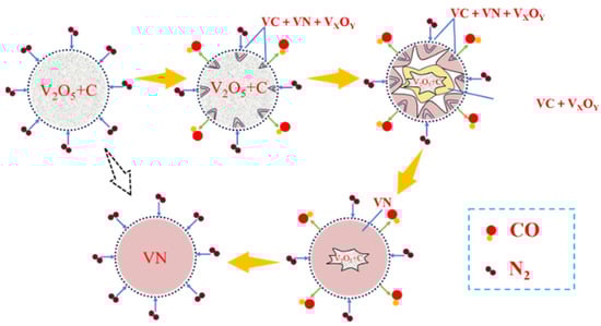 VC serves as an intermediate product in the synthesis of VN, where vanadium oxide reacts with carbon to form VC (Equations (7)–(10)), and VC subsequently reacts with N
