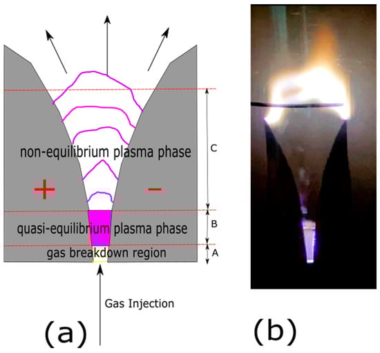 Evolution of a gliding arc discharge: (A) region of gas breakdown; (B) quasi-equilibrium plasma phase; (C) non-equilibrium plasma phase (a) and picture of gliding arc formatted in working reactor (b).