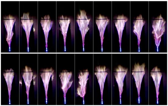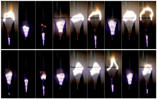 First of all, time–space evolutions of the gliding arc discharge in the studied LTP reactor are illustrated in Figure 4, Figure 5 and Figure 6, for 140 L/min, 70 L/min, and 14 L/min, respectively, by a series of 18 snapshots per each studied flow with frequency of 30 Hz.