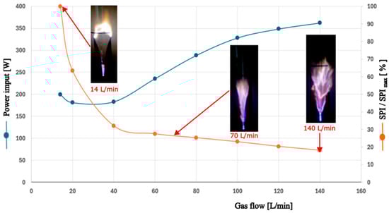 Secondly, two indicators of energetic yield in the LTP GA reactor were discussed for the purpose of all three cases, namely for 14 L/min, 70 L/min, and 140 L/min, being compared in further analysis of results. These were the power input for DEPs’ removal and the specific power input per molecule. For this reason, the specific power input per molecule (SPI) was normalized—as the ratio of power input in the studied case versus the highest power input obtained (SPImax for the “14 L/min” case). The aforementioned are shown in Figure 7 and superimposed onto the presented trends of the indicator are the chosen representative snapshots for every studied airflow.