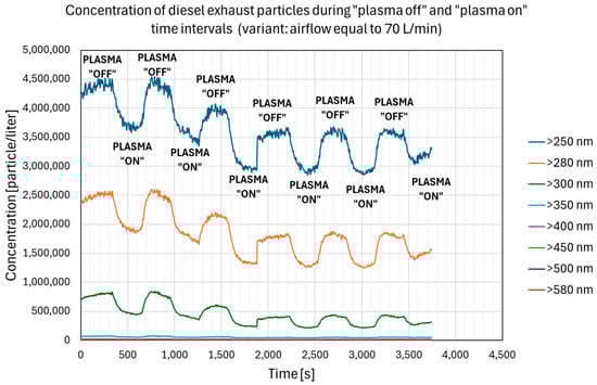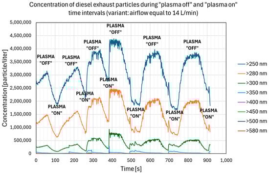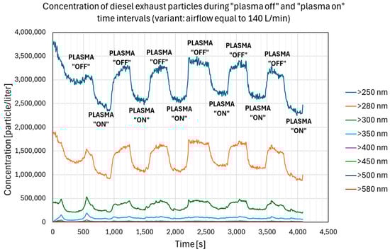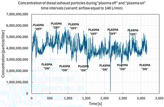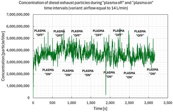 The total particle number concentrations were scrutinized in real time and presented in Figure 8, Figure 9, Figure 10, Figure 11, Figure 12 and Figure 13, so as to show the influence of plasma occurrence on the removal of DEPs of different sizes. Hence, marked are the time periods of turning on and turning off the studied non-thermal plasma reactor with gliding arc discharge (“plasma on” and “plasma off”, respectively).