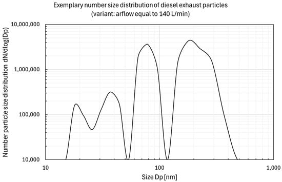 Instantaneous, exemplary number particle size distribution of smaller DEPs investigated for the “140 L/min” case.