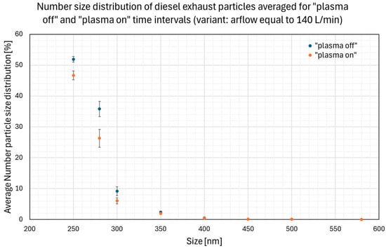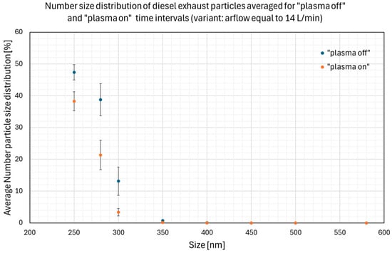 Number particle size distribution of DEPs 250–580 nm in size, averaged for “plasma off” and “plasma on” time intervals investigated for the “14 L/min” case.