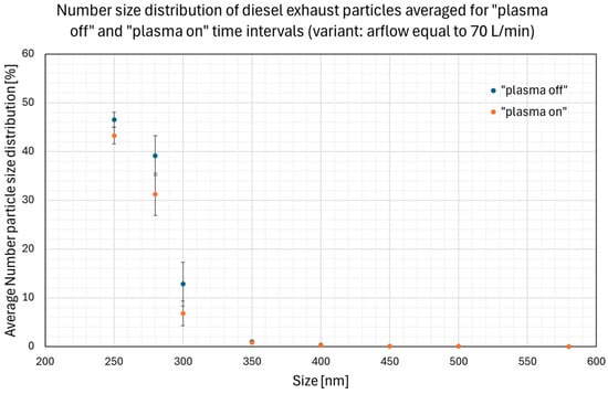 Number particle size distribution of DEPs 250–580 nm in size, averaged for “plasma off” and “plasma on” time intervals investigated for the “70 L/min” case.