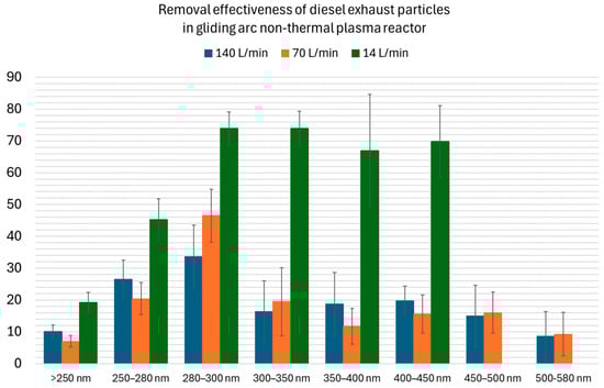 The main goal was to investigate the ability of a non-thermal plasma reactor with gliding arc discharge to remove diesel exhaust particulates (DEPs). A conventional knife-shaped LTP GA (low-temperature plasma gliding arc) reactor was utilized. The following three cases were studied: 140 L/min, 70 L/min, and 14 L/min of air drawn through the reactor, and diesel exhaust fumes were sampled continuously. They were assayed in terms of concentration and number particle size distribution. The higher the residence times, the higher the energy input that may be utilized for DEPs’ removal. The reactor performance definitely lowered the concentration of DEPs (250–580 nm) and altered their number size distribution. There was no effect on the number concentration, nor the particle size distribution, of DEPs of 10–250 nm in size. Regarding the effectiveness of DEPs’ removal, decreasing the flow rate from 140 L/min to 70 L/min somehow altered the values. Achieving the airflow of 14 L/min led to a substantial improvement (even to a fourfold increase for 300–480 nm particles). Non-thermal plasma reactors with gliding arc discharge may be successfully adapted to the process of DEP treatment. Their performance may be optimized by adjusting the airflow at the inlet of the reactor to guarantee the longest aerosol residence times and the highest removal efficiency.
