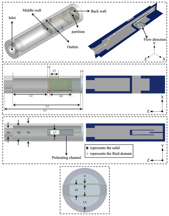 The newly developed micro cylindrical combustor was designed with the aid of ANSYS Design Modeler. Its schematic representation is depicted in Figure 1 and all dimensions are provided in Table 1. The main idea behind the novel design lies in establishing the middle and back walls. The former acts as a heat holder of the high-temperature flame and, also, a flame distributor toward the outer walls to enhance the heat transfer process from the thermal energy that results from the combustion to the upper and lower external walls. The back wall recirculates the heat to the inner preheating channel, aiming to extend the blow-off limit and to increase the heat transfer capacity between the flame and the solid walls. The partition established at the end of the micro combustor is built to ensure that the hot flow enters the preheating channel.