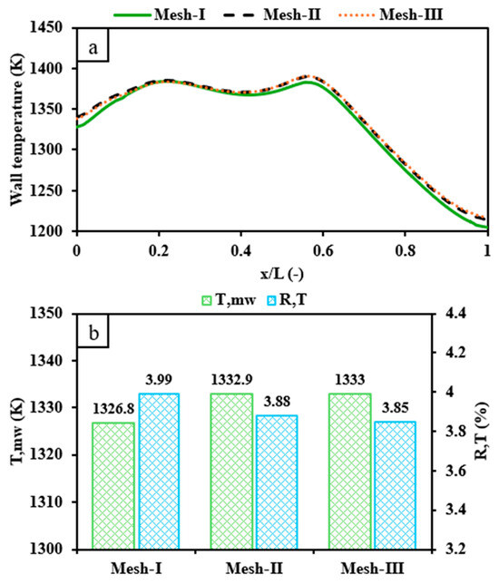 Figure 2 shows the comparison between the highlighted mesh resolutions in terms of wall temperature, area-weighted-mean wall temperature and wall temperature uniformity . As seen in Figure 2, the numerical findings of Mesh-II are very similar to those of Mesh-III; however, the low-numbered mesh case (Mesh-I) is more conducive to lowering the computed wall temperature than the higher-numbered mesh cases. In addition, the deviations of and between Mesh-I (Mesh-II) and Mesh-III are roughly 0.5 K (0.01 K) and 3.6% (0.78%), respectively. Thus, the mesh of 451,954 cells (Mesh-II) is selected for the rest of the simulations as it ensures accurate predictions and reasonable computing efforts.