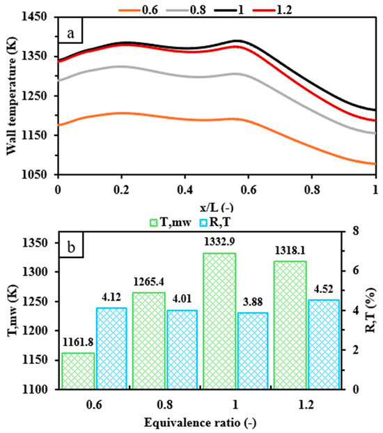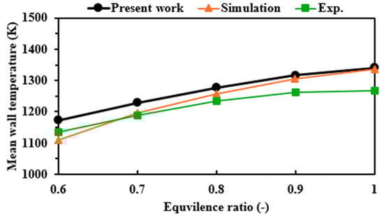 A comparison of numerically predicted mean wall temperature of the current simulations with experimental [56] and computational [57] findings at various equivalence ratios.