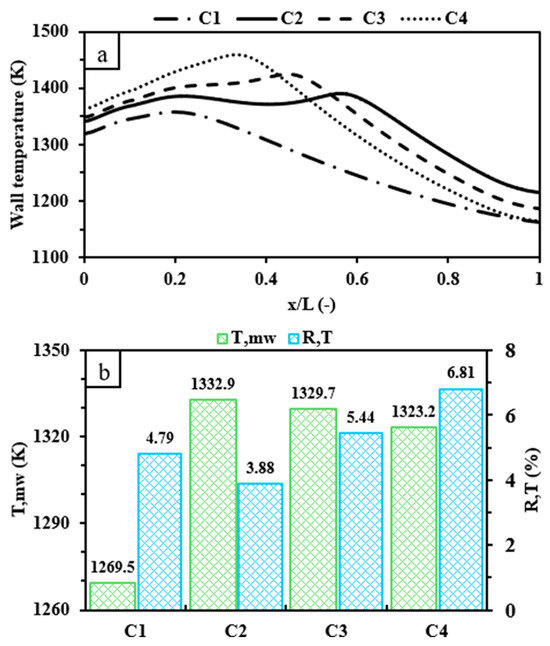 Figure 4b depicts the variation in the mean wall temperature and the wall temperature uniformity for C1, C2, C3, and C4. It reveals that the proposed design leads to the potential escalation of , as C1 is lower than C2, C3, and C4 by 63.4, 60.2, and 53.7 K, respectively. Surprisingly, Figure 4b shows that C1 achieves a more uniform wall temperature than C3 and C4 but less uniformity than C2. This fluctuating trend could be caused by the ideal location of the middle wall, because hydrogen is characterized by a high flame speed and therefore requires a greater volume to propagate freely to then maximize the benefits from its high energy content. In general, the variation in and indicates that C2 is optimal for improving the wall temperature’s key parameters. It is noteworthy that the high wall temperature may result in a decrease in the structural strength of the wall materials. Therefore, thermal barrier coatings or ceramic material are important to consider in the wall manufacturing process in order to withstand the high temperature.