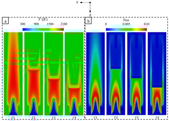 Figure 5 illustrates the variations in temperature and OH mass fraction throughout the combustion chamber under different preheating channel lengths of the micro cylinder combustor. Figure 5a displays that the high-temperature flame of C1 tends to narrow toward the outlet; however, the presence of the preheating channel in C2, C3, and C4 exhibits an effective means of widening the area of high temperature to be near the walls at the middle wall positions. Furthermore, as the middle wall prevents the free propagation of flame in the center of the micro combustor domain, it is then propagated in the volumetric space between the inner channel and external walls. This enhances the wall temperature distribution and confirms the findings shown in Figure 4. Furthermore, this improvement is enhanced as the heat-recirculating channel is shorter, highlighting the importance of allowing the hydrogen flame to propagate freely in a larger space. The distribution of OH radicals is depicted in Figure 5b and behaved similarly to the temperature distribution. It is noteworthy that employing the preheating channel appears to widen the OH variations, thus indicating a more intense and vigorous chemical reactivity closer to the outer walls.