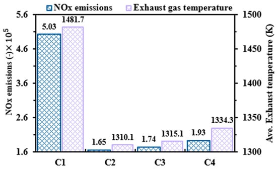 Figure 6 shows the effects of the micro combustor configurations on NOx emissions and exhaust gas temperature. The variations in NOx pollution highlight that the newly designed combustor greatly decreases such harmful emissions by improving the heat absorption coefficient of the walls and, additionally, recirculating the high-temperature flow for preheating purposes instead of releasing it into the atmosphere. These effects lead the average exhaust gas temperature to decrease, which indicates that lower thermal energy is wasted from the system. However, decreasing the length of the heat-recirculating channel results in further optimization, as the NOx emissions and average exhaust gas temperature are reduced when the inner channel changes from long (C4) to short (C2). This highlights that the thermal performance is promoted by the preheating channel, and, moreover, the shorter channel is beneficial for further improvements in the heat transfer process.