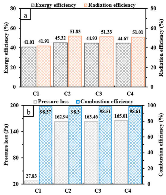 The discrepancies in exergy, radiation, and combustion efficiencies, and the pressure drop with respect to various micro combustor configurations, are shown in Figure 7. As depicted in Figure 7a, the presence of the preheating channel tends to improve the exergy efficiency, as the efficiency of the conventional micro combustor (C1) is lower than that of the newly designed ones (C2, C3, and C4) due to the high exhaust gas temperature of the former. Similarly, Figure 7a indicates that radiation efficiency is greatly enhanced by the preheating channel, as the differences between C1 and C2, C3, and C4 are 9.9%, 9.4%, and 9.1%, respectively, confirming the potential of the newly proposed design to enhance system performance. However, the variation in inner channel lengths tends not to greatly affect the system efficiency as the exergy and radiation efficiencies of C2, C3, and C4 are highly comparable. Figure 7b demonstrates that the majority of the fuel is consumed for all test cases because their combustion efficiencies are mostly the same. However, employing the preheating channel (C2, C3, and C4) notably increases the pressure drop in comparison to the case without this channel (C1). This suggests that the presence of the middle and back walls forms barriers in front of the premixed charge flowing from the inlet, which implies that the newly proposed design requires more pumping power.