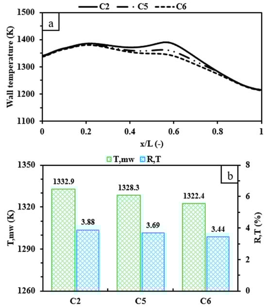 Figure 8a shows the distribution of temperature over the external walls at various preheating channel widths. It can be seen that varying the channel width tends not to affect the wall temperature trends in the inlet and back wall regions; however, the wide channel structure (C2) is conducive to increasing the wall temperature from an x/L of 0.2 to 0.8. This suggests that widening such a channel exhibits a more effective means of holding a larger quantity of the high-temperature flame, which consequently improves the heat transfer to the walls. In addition, the wide heat-recirculating channel has a larger volume, and this ensures that the reversed hot gases preheat the incoming flow from the inlet at a higher degree. These conditions lead the of C2 to increase by 4.58 and 10.44 K compared to C5 and C6, respectively, as illustrated in Figure 8b. However, C2 exhibits slightly less uniformity in the wall temperature than C5 and C6, which can be attributed to blocking a relatively higher amount of thermal energy in the middle wall zone.