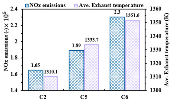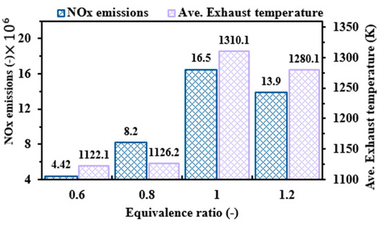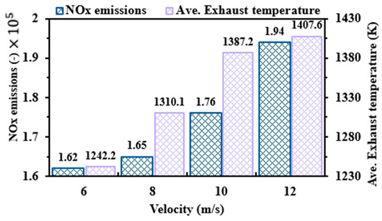 Figure 14 demonstrates the changes in NOx emissions and average exhaust gas temperatures with variations in from 6 to 12 m/s. The production of harmful pollution like NOx is noticeably increased in high-temperature environments [61], and hydrogen combustion releases high thermal energy owing to its high diffusion mobility and flame speed. Hence, the NOx emissions continually increase with elevations in from 6 to 12 m/s. Furthermore, increasing is conducive to increasing the average exhaust gas temperature, which indicates that feeding the system with a higher hydrogen flow rate results in a greater waste of thermal energy from the system. These observations suggest that lowering the inlet velocity optimizes both the performance and emission characteristics.
