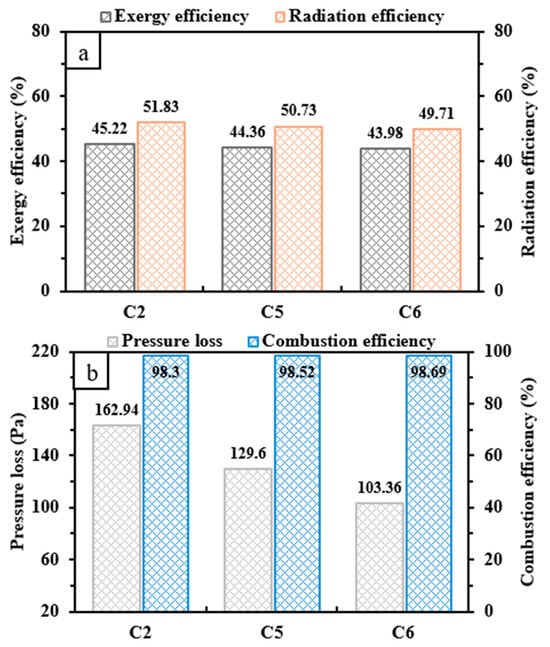 Figure 11 presents the variations in exergy, radiation, and combustion efficiencies along with the pressure loss with respect to different widths of the heat-recirculating channel. The higher exhaust gas temperatures of C5 and C6 cause the exergy efficiency to decrease by 0.86 and 1.24% compared to C2, as shown in Figure 11a. In contrast, the radiation efficiencies of C2, C5, and C6 are 51.83%, 50.73%, and 49.71%, respectively, which results from the pronounced improvement in the heat absorption rate of the wall when broadening the channel width. Figure 11b illustrates that the combustion efficiencies of all the test cases are highly comparable, which indicates that the width of the preheating channel tends not to play a role in the fuel consumption rate. However, increasing the heat-recirculating width results in an increased pressure drop due to a higher quantity of combustion products being held, which requires slightly more pumping power.