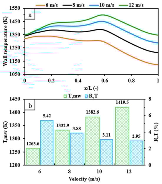 Figure 12a illustrates the wall temperature distribution over the dimensionless length (x/L), where L is the distance from the inlet and outlet and x is the distance from the inlet. As can be seen, three distinct outcomes result from the variations of , which are at the inlet region, the back wall region, and the maximum wall temperature. At the inlet micro-combustor wall, the wall temperature of the 6 m/s case is 1319.3 K, which represents the lowest wall temperature when compared with 8, 10, and 12 m/s, as the wall temperature of the latter three cases is roughly 1345 K. This confirms that the effects of are limited in this zone and vanish from 8 m/s onward. At the back wall region, the higher yields an obviously higher wall temperature, as this region at 12, 10, 8, and 6 m/s is 1345.93, 1286.88, 1214.45, and 1123.99 K, respectively. Similarly, the maximum wall temperature clearly increases with increasing due to the system being fed with more hydrogen and more thermal energy being released accordingly. Thus, gradually increases with increasing , as shown in Figure 12b. In addition to the increase in , exhibits a decreasing trend as approaches 12 m/s. This suggests an improvement in the wall temperature uniformity across the external wall, which can be attributed to the more optimal flame expansion at higher . Furthermore, the reaction zone occurs in a better location, as it moves farther downstream with the increasing owing to the diffusion coefficient being promoted by the injection of more hydrogen (as observed in Figure 13).