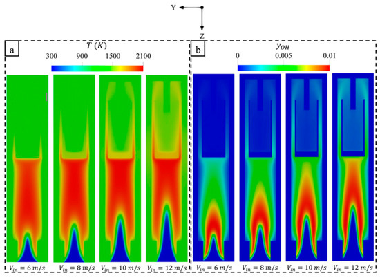 Contours of (a) temperature and (b) OH mass fraction distributions on cross-section at various inlet velocities.
