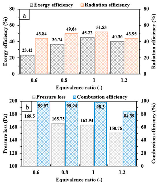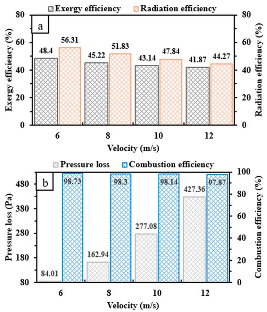 Figure 15 illustrates the effects of varying on the exergy, radiation, and combustion efficiencies as well as the pressure loss. Increasing leads both the exergy and radiation efficiencies to decrease, as depicted in Figure 15a. These reduction trends could be ascribed to the high exhaust temperature [62]. It is true that elevating increases the energy input and the combustion temperature; however, the micro scale combustor seems to be limited in terms of accommodating a large amount of energy. Similarly, as shown in Figure 15b, the combustion efficiency is very high for all cases and decreases slightly with elevations in because of the relatively lower consumption rate of hydrogen. In contrast, the pressure loss progressively increases when increases, as shown in Figure 15b. This suggests that increasing appears to significantly increase the collision rate between the incoming flow from the inlet and the middle and back walls, which leads to a need for more pumping power.