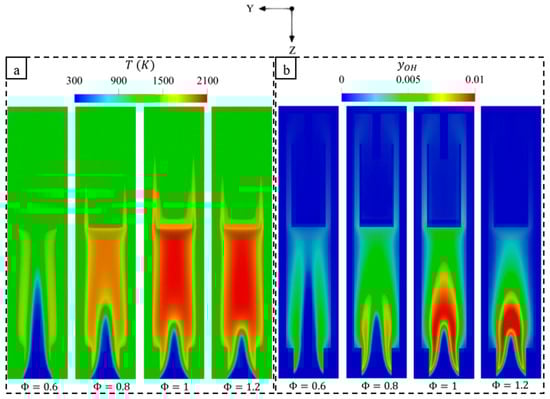 Figure 13 shows the distributions of temperature and OH mass fraction over the y-z cross-sectional plane. As shown in Figure 13a, the increase in moves the onset of combustion downstream owing to the enhanced mass diffusion. The area occupied by the high-temperature flame with elevating is narrower because the distance between the combustion initiation and middle wall is shorter. This highlights that the middle wall in such conditions holds greater thermal energy and, hence, the solid walls absorb more heat. The increase in leads to a rise in the mass flow rate of hydrogen and consequently the maximum temperature.