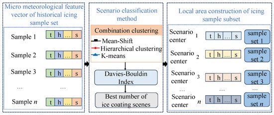 To address these issues, we propose a novel clustering algorithm, M-H-K, which integrates three distinct techniques. First, mean-shift (MS) identifies clustering centers based on the density distribution of the data [26], thereby avoiding the randomness associated with traditional methods and providing more reliable initial cluster centers. Second, hierarchical clustering (HL) combines the initial centers determined by MS to form an appropriate number of clusters [27], allowing for the dynamic determination of cluster numbers through the merging of similar clusters. Finally, K-means refines the clusters identified by MS and HL, enhancing the stability and accuracy of the clustering results through iterative adjustments. Figure 1 shows the schematic diagram of the classification of the ice coating scenarios, where t represents the temperature feature, h represents the humidity feature, and s represents the wind speed feature. The specific process of the integrated clustering method is shown in Figure 2, and its specific division process is as follows: