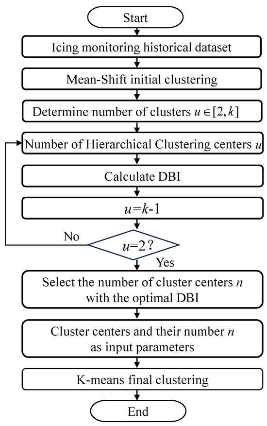 The Davies–Bouldin Index (DBI) is a commonly used metric to assess the quality of clustering results. It measures the closeness within clusters and the separation between clusters by calculating the average distance between different clusters and the average distance between data points within clusters [28]. In practice, a smaller DBI indicates a better clustering effect because smaller intra-cluster distances and larger inter-cluster distances imply better-quality clustering results. The calculation of DBI is relatively simple, and its value has a small range of variation, so it is suitable as an indicator of the validity of clustering for ice-covered scenarios. Its calculation formula is as follows: