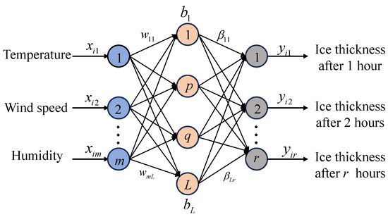 ELM is a learning algorithm for Single Hidden Layer Feedforward Neural Networks (SLFNs), proposed by Huang [32]. Numerous studies have demonstrated that ELM possesses a robust capacity for learning representations, boasting rapid learning speeds and strong generalization abilities [33,34]. Structurally, the ELM is a three-layer neural network comprising input, hidden, and output layers connected through a fully integrated architecture. Figure 3 illustrates its network structure. In this article, the input is meteorological features, and the output is ice thickness under different prediction durations. The core concept behind ELM involves utilizing a large-scale matrix of randomly generated neurons in the hidden layer to map input samples swiftly. The network adjusts the weights through a linear output layer to derive the final output. This random initialization process eschews the need for parameter tuning, significantly accelerating the training phase. Unlike traditional Back Propagation (BP) neural networks, ELM assigns initial weights to the hidden layer randomly and keeps them unchanged throughout the optimization process, focusing only on calculating the output variable weights during learning [35]. This unique approach reduces training times and enhances ELM’s capability to handle complex nonlinear processes and time-varying characteristics, making it well suited for predicting variations in ice coating thickness.