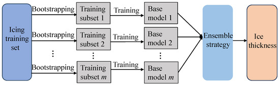 After dividing the multi-scenarios of ice coating, in order to make the individual models different from each other, this chapter starts from the perspective of manipulating the input features with the help of the idea of the ensemble strategy of bagging, which is a commonly used ensemble learning method and consists of bootstrap and aggregating. Bootstrap refers to the method of putative sampling, which is a putative back-sampling method, which constructs a different sub-dataset for each weak learner to train by sampling the original dataset with putback [31]. Aggregating refers to the strategy of combining the outputs of multiple weak learners. For the bagging algorithm, a number of sample subsets obtained can be considered independent of each other and do not interfere with each other so that the training of multiple base models can be run side by side at the same time, which speeds up the training speed of the model to a certain extent, and is good at improving the stability of the model that is very sensitive to small changes in the training set, and, at the same time, the sample subsets of the various scenarios are obtained by random sampling, which can enhance the generalization ability of the prediction model and effectively reduce the variance of the prediction model.