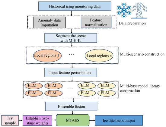 Subsequently, the model with the smallest RMSE within is selected, signifying the most precise prediction. The MTAES model employs an integration of multiple meteorological scenarios, thus enhancing the predictive performance. It is ensured that denotes the minimum distance from the validation set to the optimal center of the ice accretion meteorological scenario, corresponding to that aligns best with the optimal scenario center. , characterized by a diversity of base models, not only broadens the model’s applicability across various scenarios but also consolidates the robustness of the MTAES model in efficiently managing diverse ice accretion prediction tasks.