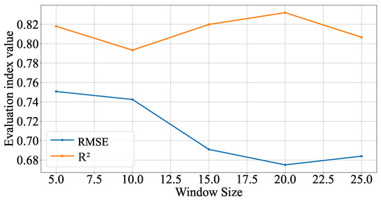 It can be observed from the figure that, with the increase in window size, the root mean square error and determination coefficient of the model show different characteristics. When the window size of RMSE gradually increases from 5 to 10, the prediction performance decreases. However, when the window size continues to increase to 15, RMSE tends to be stable, and then there is a slight upward trend near the window size of 20, indicating that windows that are too large may cause the model to capture unnecessary noise, thus affecting the prediction accuracy. The regression coefficient increases with the increase in window size from the window size of 5, proving that the ability of the model’s explanatory variables continues to improve. The peak value is reached when the window size is 20, indicating that the model’s interpretation ability is the best at this time. After that, as the window size continues to increase to 25, there is a significant decline, and the adaptability of the model to the data characteristics decreases. It can be concluded that the model’s overall performance is ideal when the window size is between 15 and 22. When the window size is 20, the two indicators are optimal. Therefore, this chapter selects 20 as the window size of the prediction model. At this time, the model has a relatively good response speed to historical information and future trends.