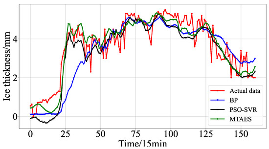 To verify the effectiveness of the methods proposed in this chapter, this study adopted various perspectives and selected several typical prediction models for comparative analysis. SVR represents the global SVR model; the penalty coefficient C was set to 10, and the radial basis function was selected as the kernel function. Pls stands for the global PLS model; the number of components was set to 2, and the zoom data option was selected. Elm represents the global elm model; the activation function was sigmoid, and the hidden layer size was 10. BP represents the global BP model; the activation function was sigmoid, the learning rate was set to 0.1, and the optimizer was Adam. Lstm represents the global LSTM model, with 64 hidden layer neurons and three layers. PSO-SVR refers to the combined model of particle swarm optimization algorithm and support vector machine. The parameters of SVR are optimized by PSO. The particle swarm size was 30, the inertia weight was 0.3, and the learning factor was 0.5. MSEELM- Average represents the elm model based on adaptive selective integration, and the results of the base model are fused in a simple average way. MTAES-k refers to the two-stage integrated prediction of icing multi-regions based on K-means clustering. Its basic idea is to cluster the training sample set directly using k-means to obtain multiple regions, and then generate subsets according to the divided regions to train the base model, and, finally, carry out weighted ensemble prediction. MSOAEELM represents the first-order adaptive weighted integration of regions. The basic idea is to divide regions and allocate weights based on the similarity of the Euclidean distance, and then directly establish a base model in each region without adding the second-stage weighted integration design. The MTAES method, proposed in this chapter, was further compared with models from references [16,19].