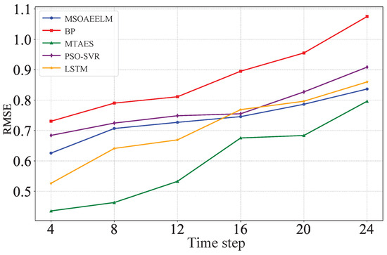The scalability of the proposed model is a critical consideration, particularly when extending the prediction duration, as it effectively increases the complexity of the time series the model must handle. Therefore, this section also compares the prediction performance of each model as the time step increases, using RMSE as the indicator. As shown in Figure 12, the proposed model consistently outperforms the other models at various time steps, demonstrating its scalability.