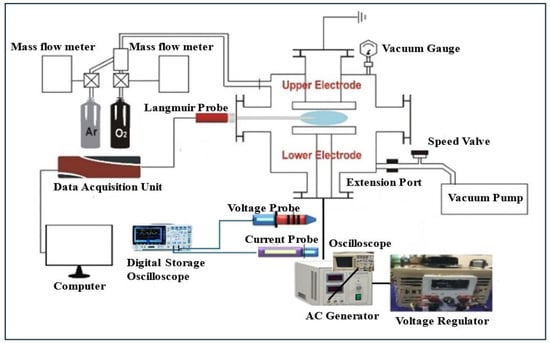 The experiment is conducted in a stainless-steel vacuum chamber with an inner diameter of 39 cm and a height of 42.0 cm [13,38]. The Ar-O2 plasma is generated in asymmetrical capacitively coupled electrodes installed with the low-temperature plasma experimental power supply, as shown in Figure 1. The key diagnostic system is the single Langmuir probe in this experiment. Significantly, the AC power offers sinusoidal output voltage that ranges from 0 to 30 kV at 6 kHz. The diameter of each electrode in the chamber is 14 cm, and a distance of 4.5 cm separates them.