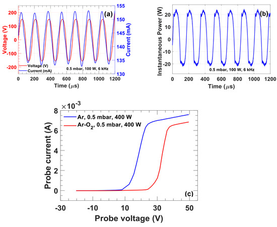 (a) Current–voltage waveform; (b) the instantaneous power as a function of time. The experiment was conducted at 4% oxygen content, 100 W applied AC power, 6 kHz fixed frequency, and 0.5 mbar pressure. (c) The I-V characteristics of AC power supply generated Argon and Ar-O2 (O2, 4%) plasma at ~400 W and 0.5 mbar.